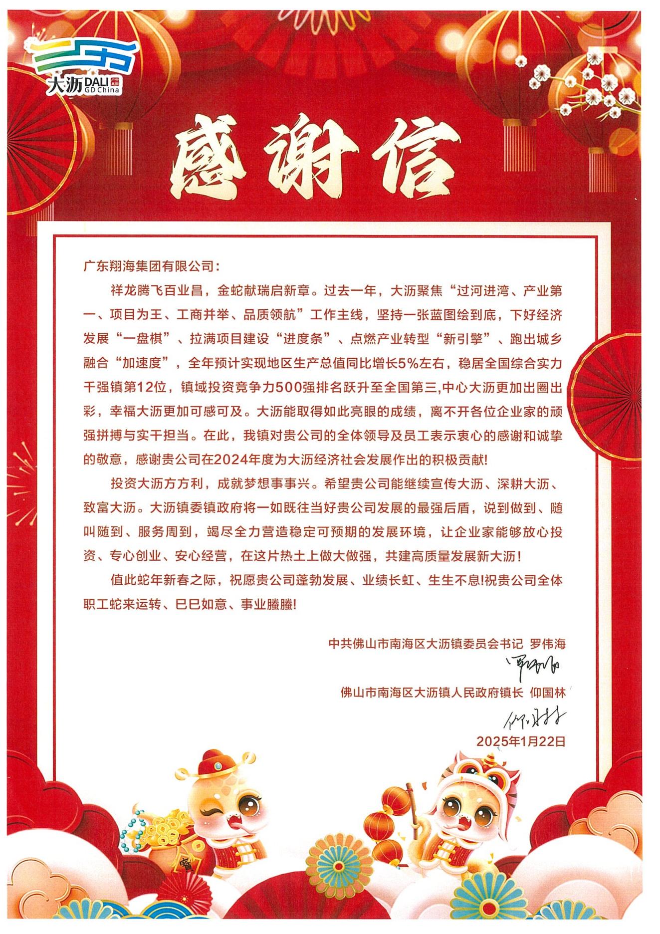 彩神官网「中国」有限公司深感荣幸,新春之际收到了一封来自大沥镇政府的感谢信。作为大沥的本土企业,我们深知企业的成长离不开当地政府和社会各界的支持与厚爱。在此,我们衷心感谢大沥镇委镇政府,感谢各位合作伙伴的鼎力支持和信任。
